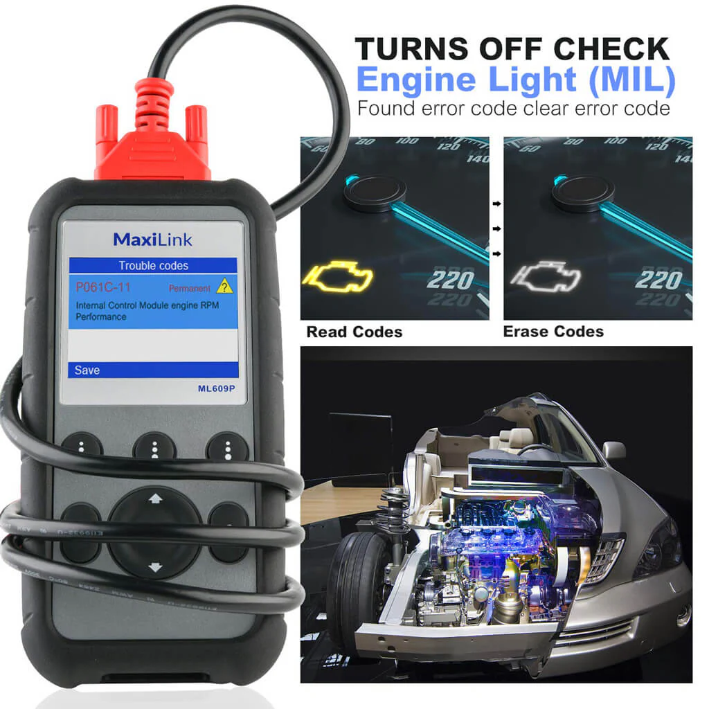 The ABS/SRS + CAN OBDII MaxiLink ML609P is built to help you determine why the Malfunction Indicator Light or the ABS warning light is on. Featured with ABS and SRS system diagnosis, 2.8āā LCD, built-in DTC lookup library, ML609P offers swift code reading function.